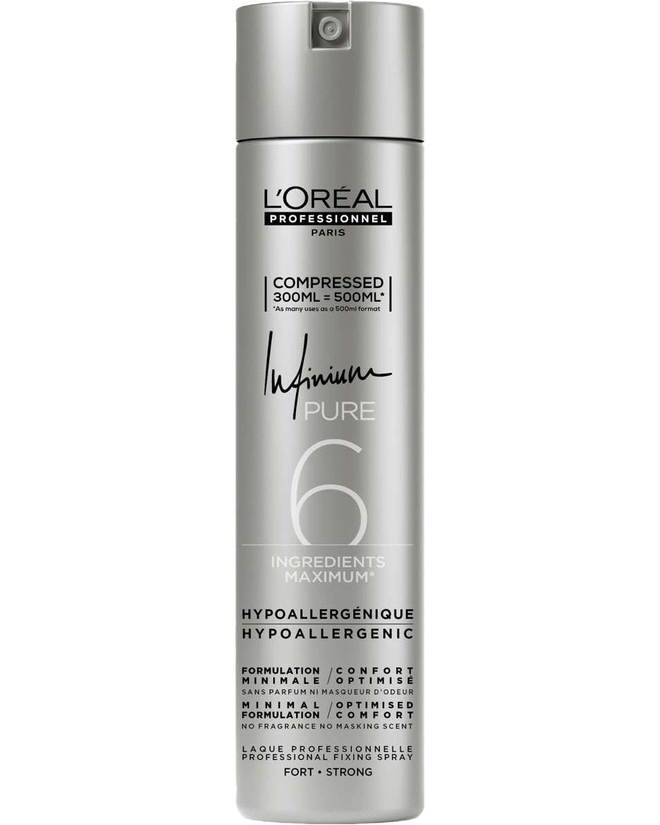 La coiffure reste bien en forme, sans que la laque ne durcisse ni ne laisse de résidus. L'Oréal Professionnel Infinium Pure Strong est une formule extra sèche et ultra-fine qui sèche immédiatement. Les cheveux ont une brillance magnifique et restent merveilleusement doux. De plus, la laque ne laisse aucune odeur dans les cheveux ni dans le salon. Infinium Pure a été conçue avec un minimum d'ingrédients et est disponible en trois forces : Soft, Strong et Extra Strong.